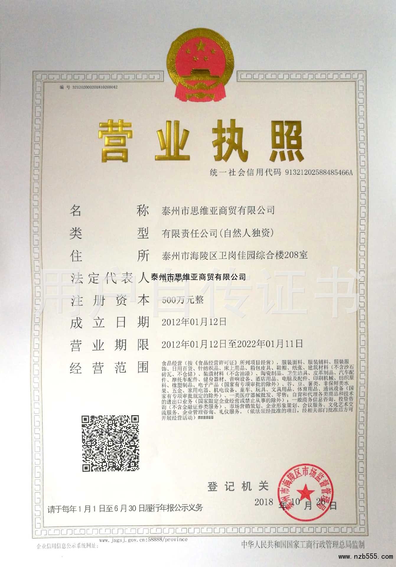 | 發(fā)證機(jī)構(gòu): | 泰州市海陵區(qū)市場(chǎng)監(jiān)督管理局 | 發(fā)證時(shí)間 : | 2018-10-26 |