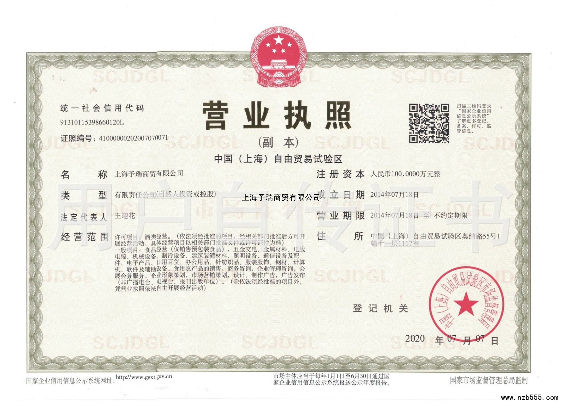 | 發(fā)證機(jī)構(gòu): | 中國(上海)自由貿(mào)易試驗(yàn)區(qū)市場監(jiān)督管理局 | 發(fā)證時間 : | 2020-07-07 |