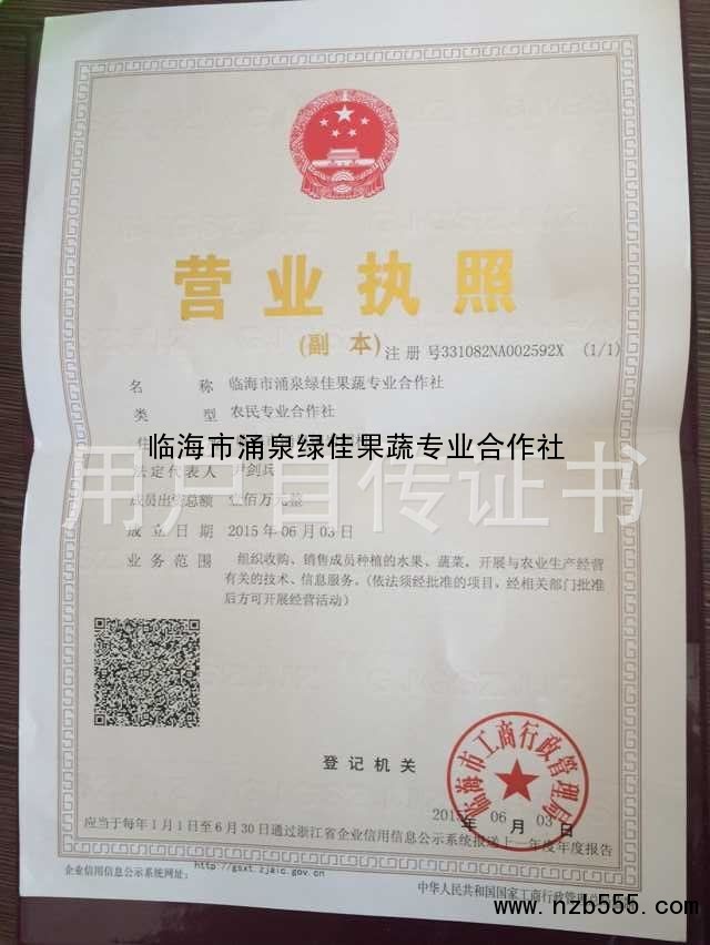 | 發(fā)證機(jī)構(gòu): | 臨海市工商行政管理局 | 發(fā)證時(shí)間 : | 2015-06-03 |