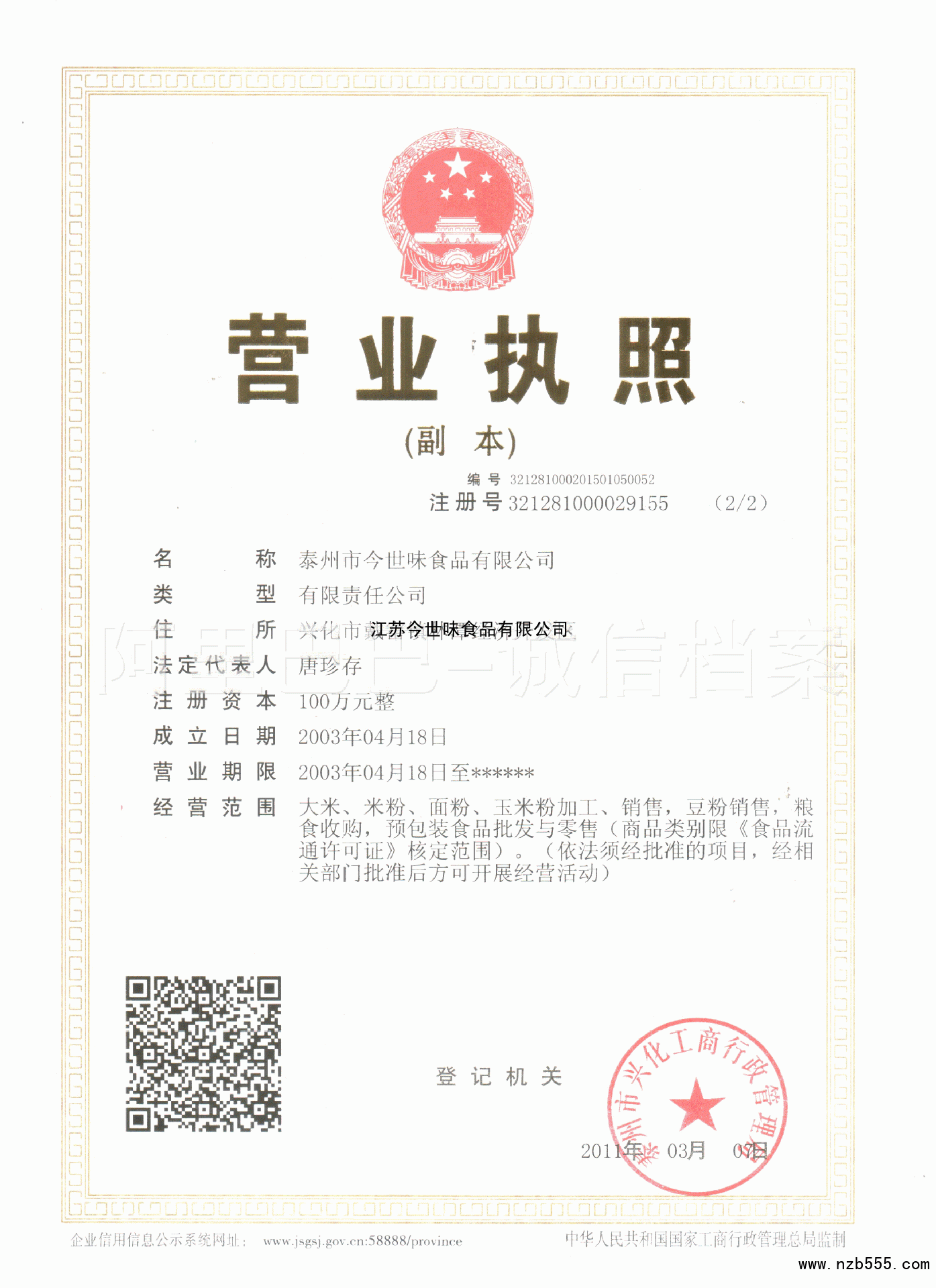 | 發(fā)證機(jī)構(gòu): | 泰州市興化工商行政管理局 | 發(fā)證時(shí)間 : | 2011-03-07 |
