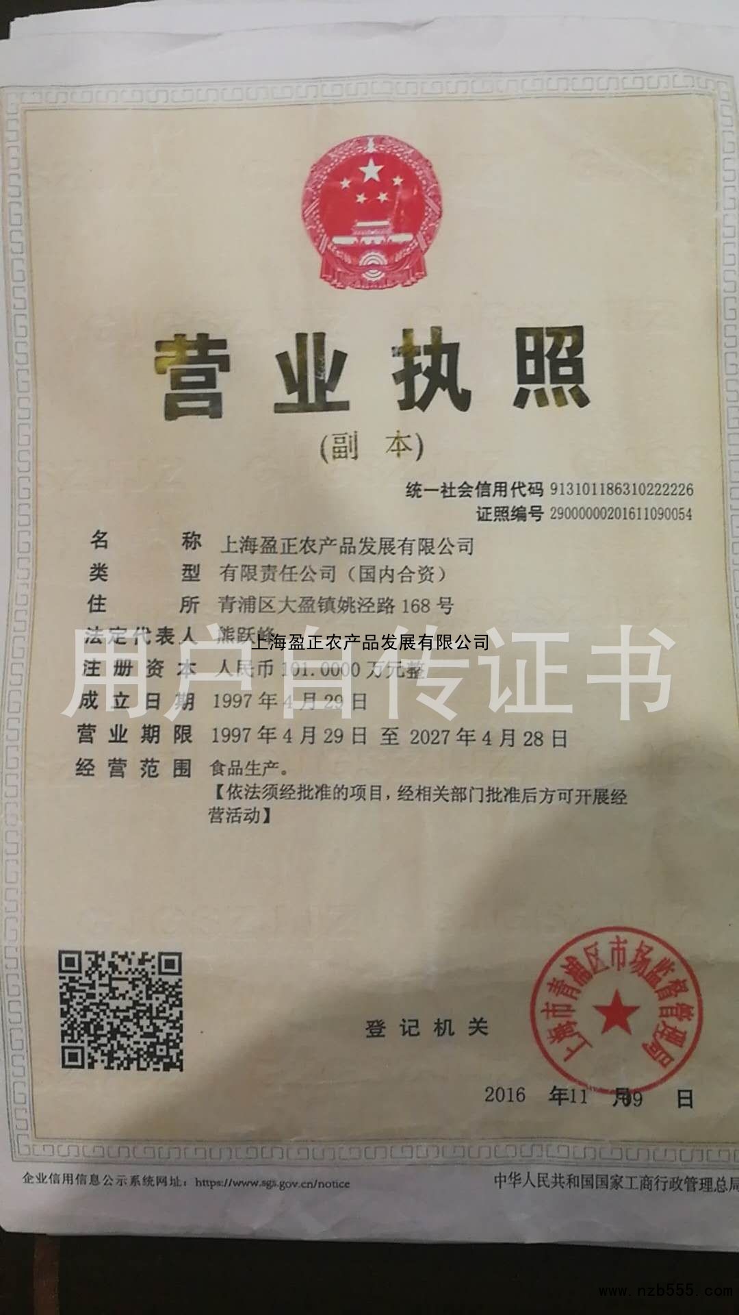 | 發(fā)證機(jī)構(gòu): | 上海市青浦區(qū)市場(chǎng)監(jiān)督管理局 | 發(fā)證時(shí)間 : | 2016-11-09 |