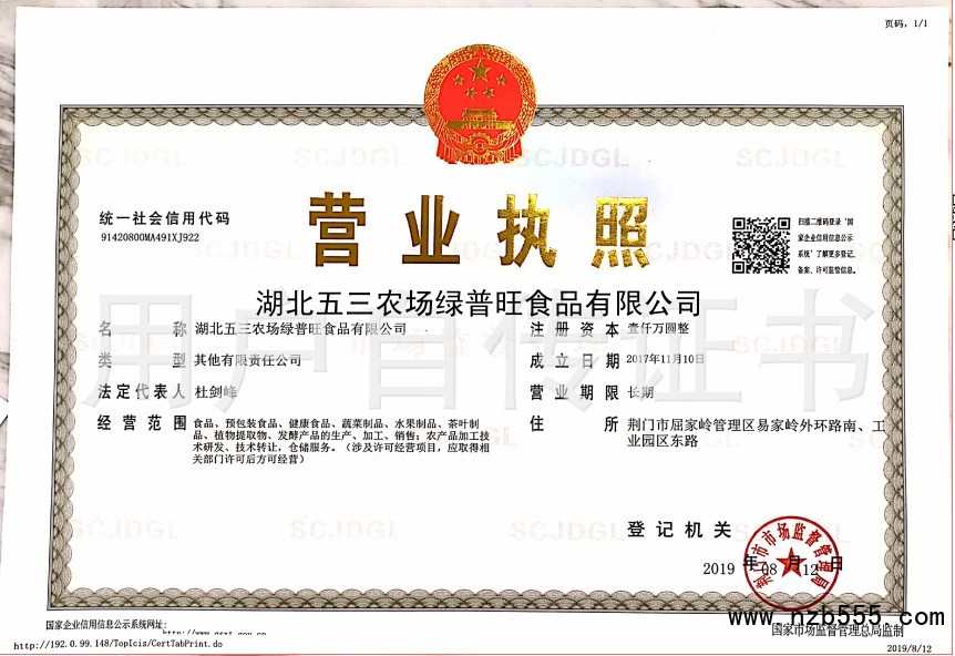 | 發(fā)證機(jī)構(gòu): | 荊門市市場監(jiān)督管理局 | 發(fā)證時(shí)間 : | 2019-08-12 |