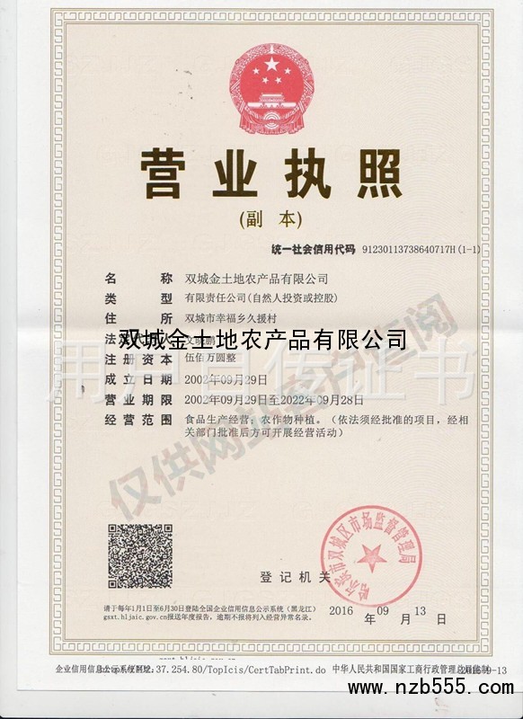 | 發(fā)證機(jī)構(gòu): | 哈爾濱市雙城區(qū)市場(chǎng)監(jiān)督管理局 | 發(fā)證時(shí)間 : | 2016-09-13 |