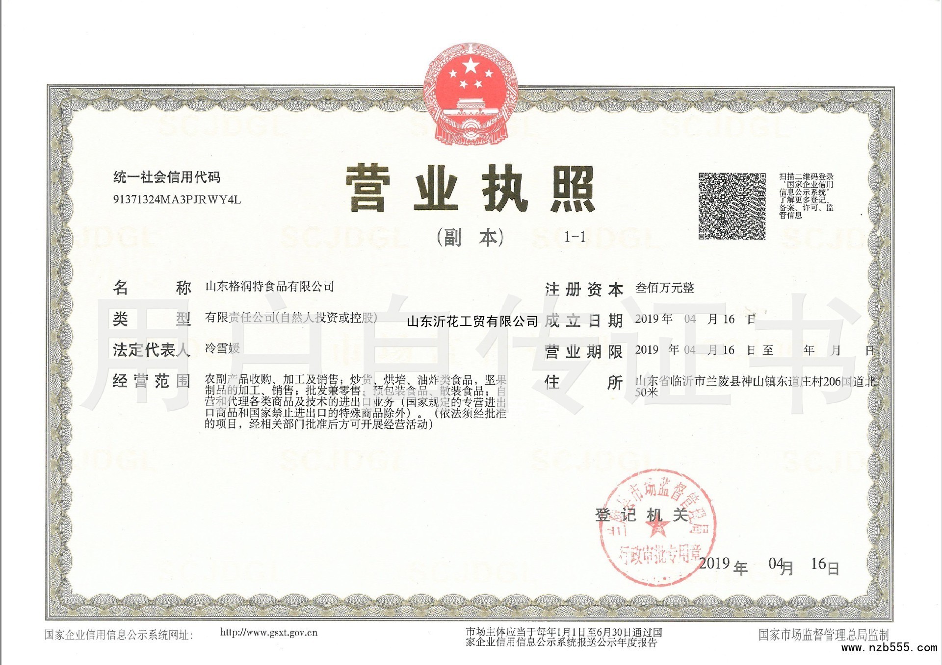 | 發(fā)證機(jī)構(gòu): | 蘭陵縣市場(chǎng)監(jiān)督管理局 | 發(fā)證時(shí)間 : | 2019-04-16 |