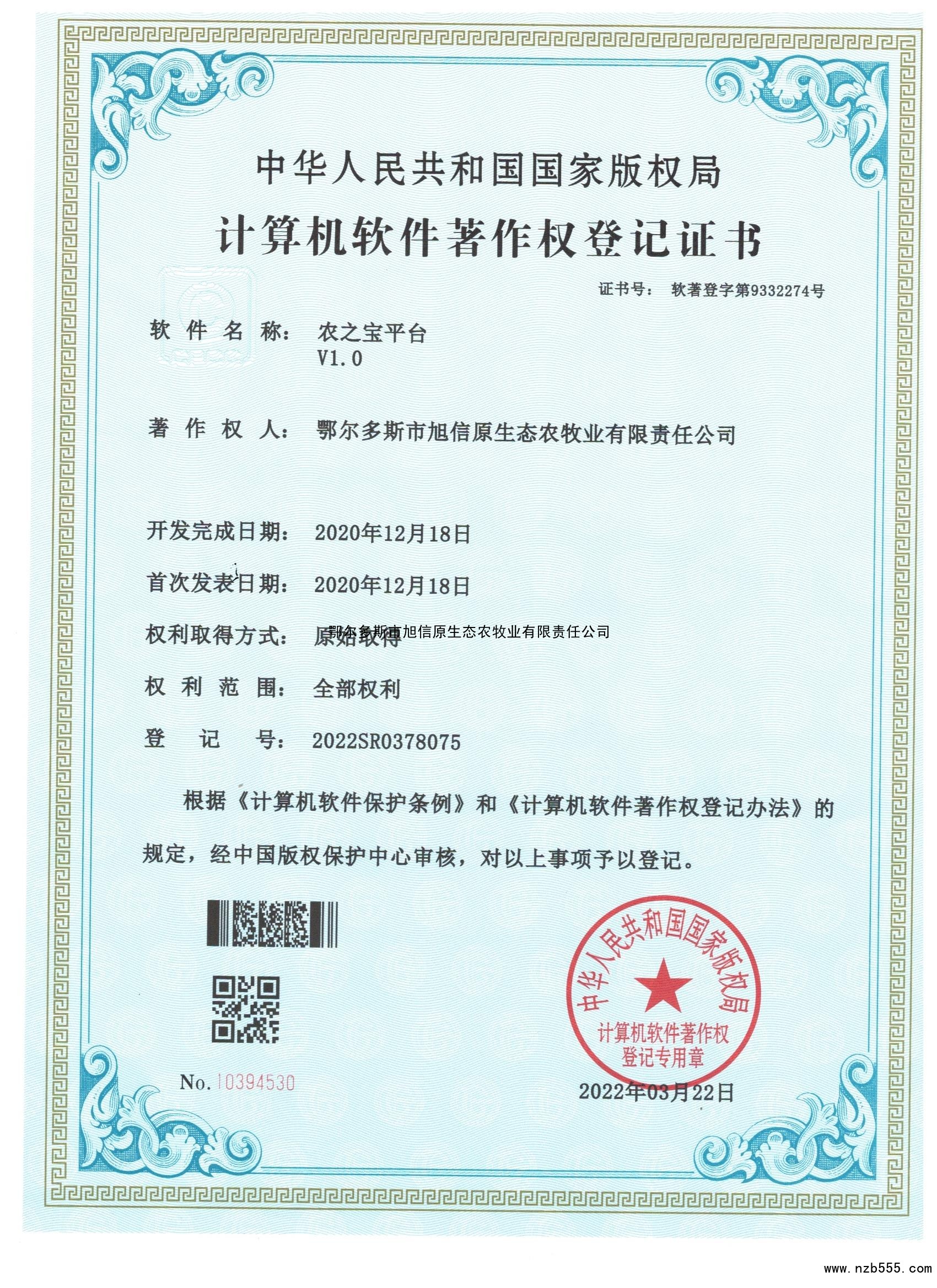 計算機軟件著作權登記證書 農之寶平臺