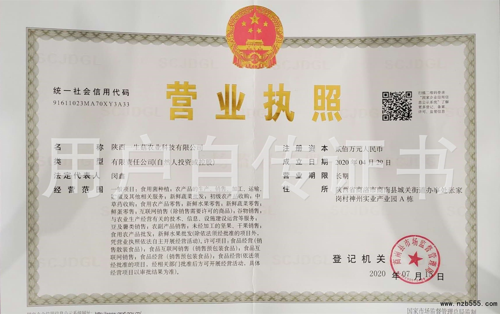 | 發(fā)證機(jī)構(gòu): | 商南縣市場(chǎng)監(jiān)督管理局 | 發(fā)證時(shí)間 : | 2020-07-15 |