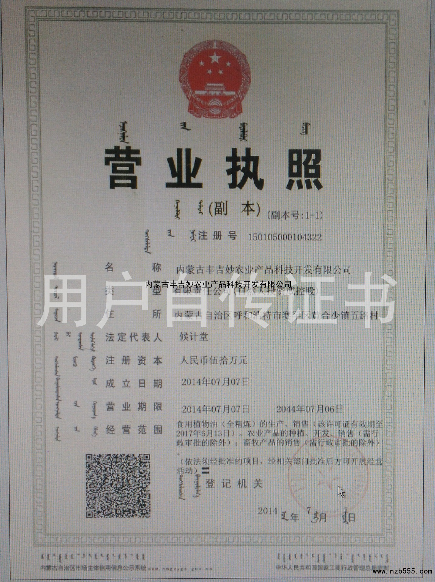 | 發(fā)證機(jī)構(gòu): | 呼和浩特市工商行政管理局賽罕區(qū)分區(qū) | 發(fā)證時(shí)間 : | 2014-07-07 |