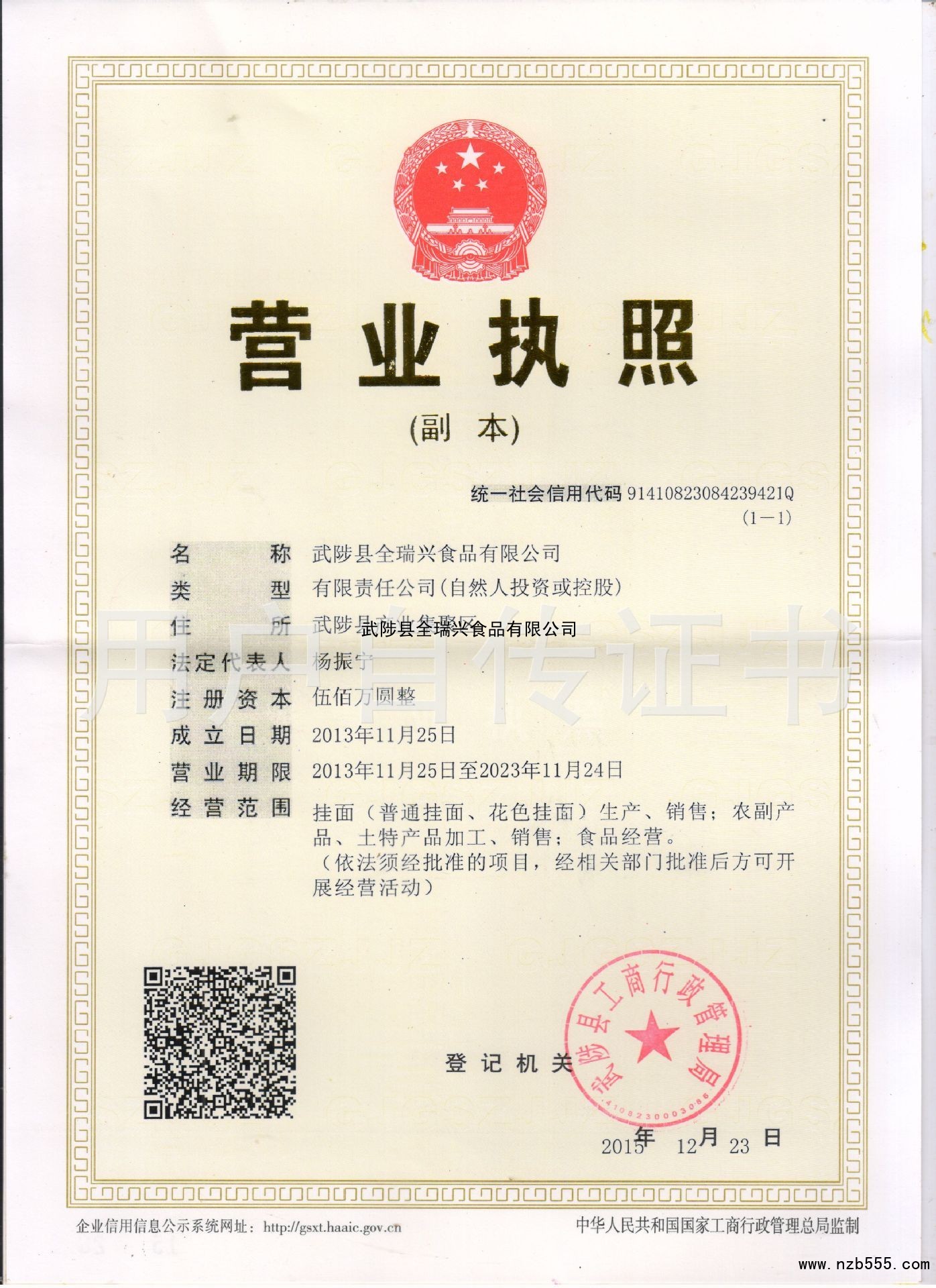 | 發(fā)證機(jī)構(gòu): | 武陟縣工商行政管理局 | 發(fā)證時(shí)間 : | 2015-12-23 |