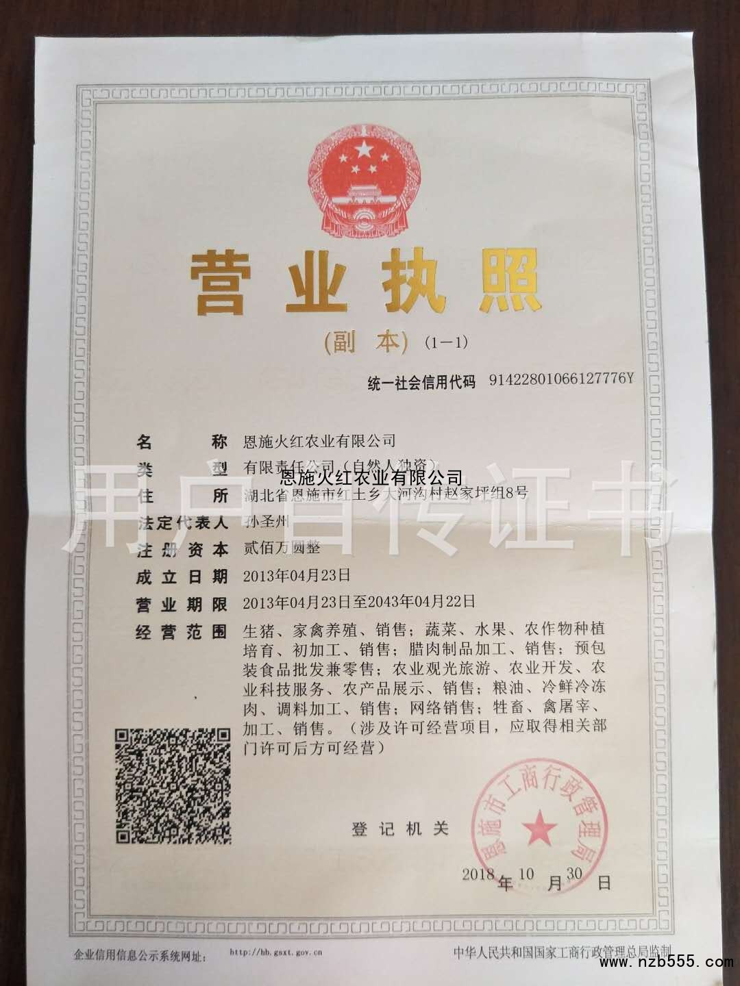| 發(fā)證機(jī)構(gòu): | 恩施市工商行政管理局 | 發(fā)證時(shí)間 : | 2018-10-30 |
