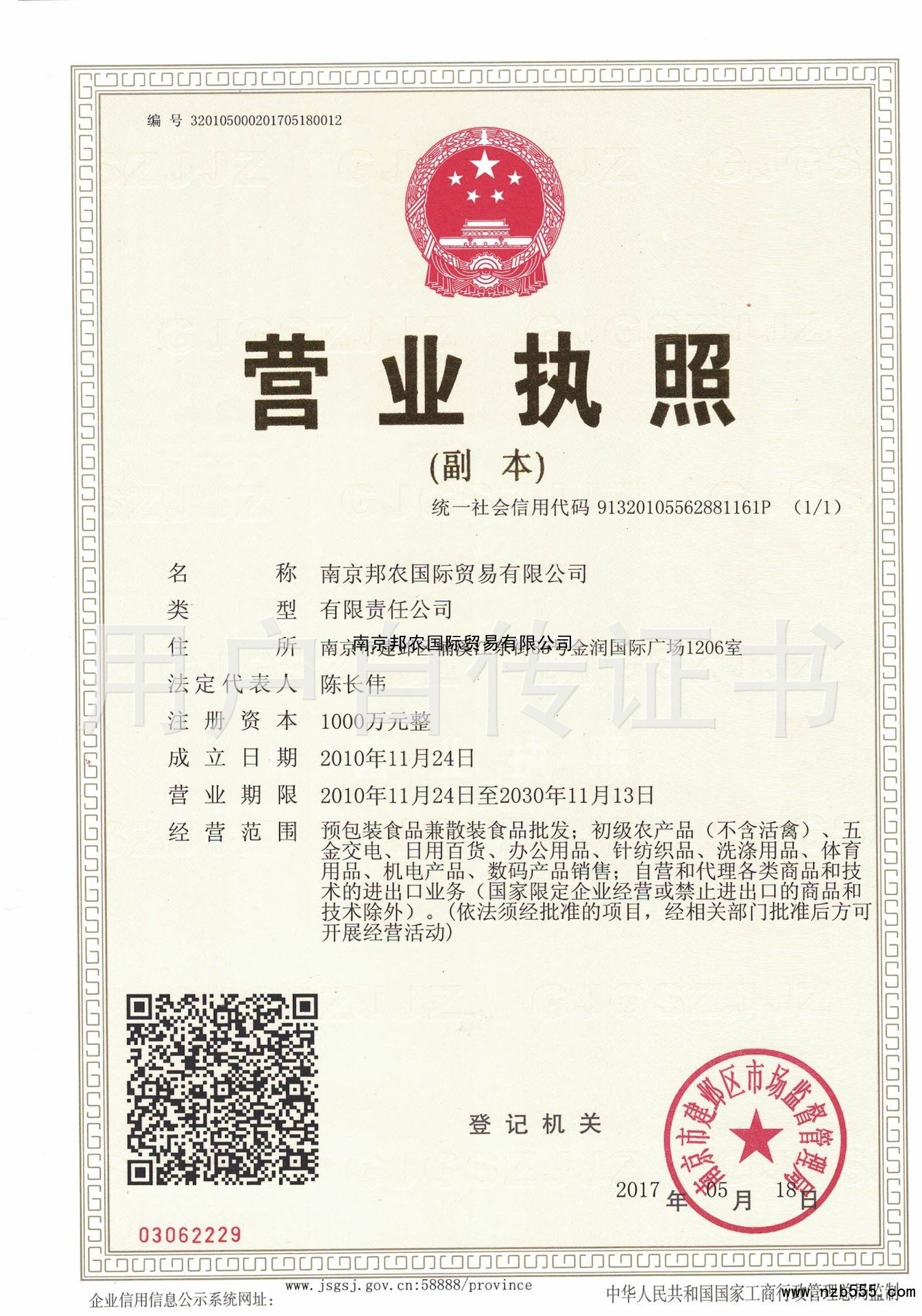 | 發(fā)證機(jī)構(gòu): | 南京市建鄴區(qū)市場(chǎng)監(jiān)督管理局 | 發(fā)證時(shí)間 : | 2017-05-18 |