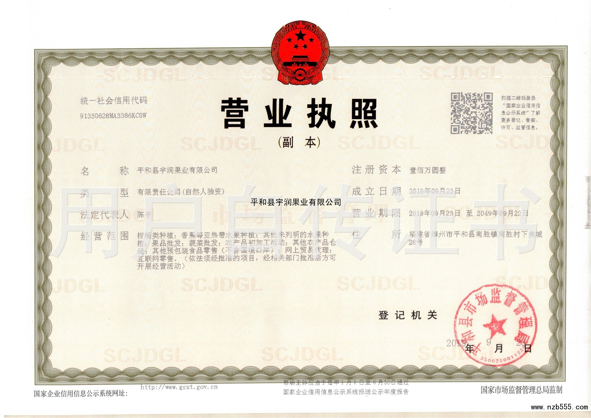 | 發(fā)證機(jī)構(gòu): | 平和縣市場監(jiān)督管理局 | 發(fā)證時間 : | 2019-09-23 |