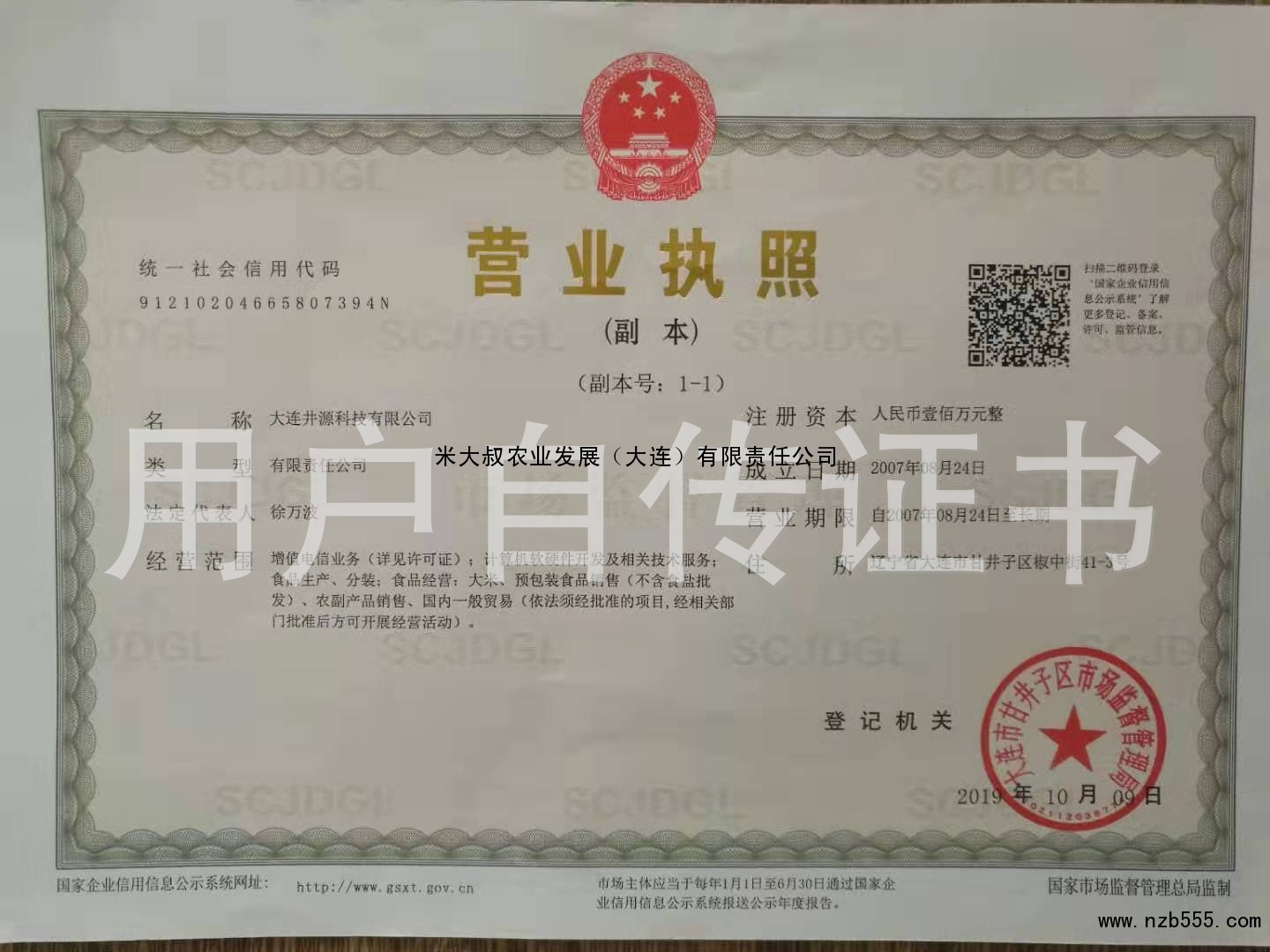 | 發(fā)證機(jī)構(gòu): | 大連市甘井子區(qū)市場監(jiān)督管理局 | 發(fā)證時間 : | 2019-10-09 |
