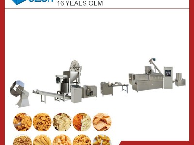 雙螺桿擠壓膨化機具有兩個相互嚙合并同方向旋轉的一對螺桿,它們共同起著輸送、摩擦擠壓和加熱的作用,靠著正位移原理輸入物料,進行強制輸送,很少形成壓力回流,從而較好的解決了單螺桿擠壓式膨化機上這方面的問題,強力輸送。膨化機集壓縮、混合、混煉、剪切、熔融、殺菌、膨化、成型等多種功能一體,在極短的時間內全部完成。模具的變換可以無限變換產品的形態和尺寸,雙螺桿膨化機可以生產線食品品種繁多,可生產休閑小吃食品、早餐谷物食品、夾心膨化食品、即溶米粉、湯料、面包片、組織化植物蛋白、糖果、調味組分、寵物食品、魚蝦飼料等,并且可以開發出無數種新型食品。